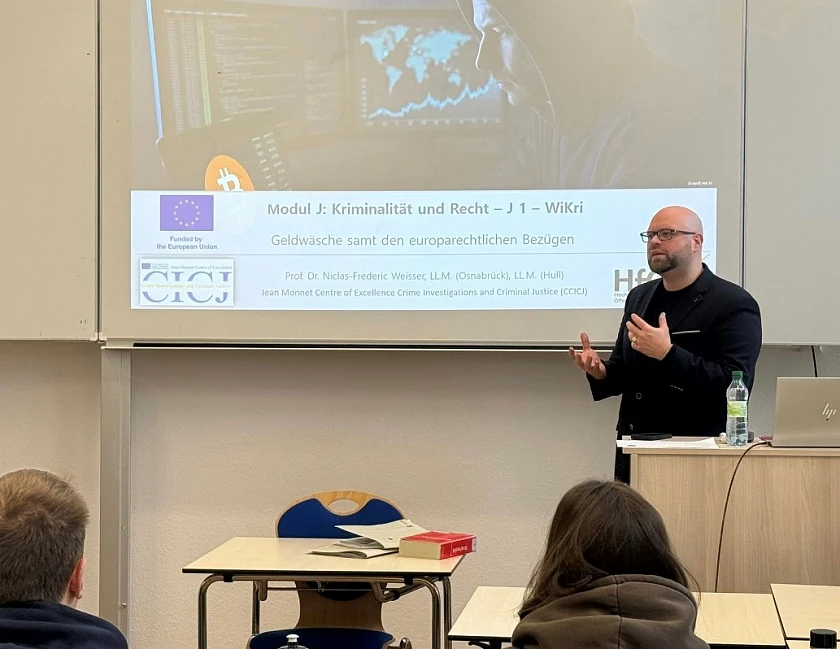 In diesem Kontext beleuchtete Herr Prof. Dr. Niclas-Frederic Weisser, LL.M. (Osnabrück), LL.M. (Hull) am 13.01.2026 für das Jean Monnet Centre of Excellence Crime Investigations and Criminal Justice (CCICJ) an der HfÖV Bremen im Studiengang Risiko- und Sicherheitsmanagement (RSM) das Thema „Geldwäsche mitsamt der europarechtlichen Bezüge“ und ging dabei auch auf die Erkenntnisse aus dem Forschungsprojekt G.E.K.O. ein.