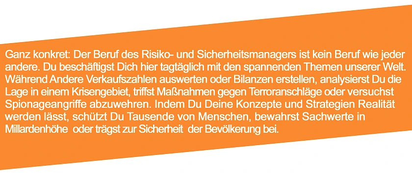 Und die Herausforderungen nehmen zu: Klimawandel, Kriege, organisierte Kriminalität oder Finanzkrisen – die Sicherheitslage verschärft sich und damit nehmen auch die Bedrohungen für Unternehmen zu. Der Bedarf nach breit aufgestellten Spezialisten ist daher groß und hier kommen Risiko- und Sicherheitsmanager:innen ins Spiel. Denn weil sie im Rahmen ihres Studiums genau auf diesen Bedarf von Unternehmen vorbereitet wurden, können sie vielen unterschiedlichen Bedrohungen gezielt entgegenwirken. Dazu entwickeln sie komplexe Strategien und Konzepte, um Menschen (wie Mitarbeiter:innen oder Besucher:innen), Sachwerte (wie Gebäude oder Maschinen) und immaterielle Werte (wie Informationen und Ideen) zu schützen.