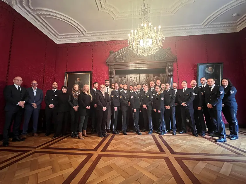 Die Ausrichtung des Masterstudiengangs in Bremen und damit auch das erste Studienjahr des 18. Masterstudiengangs mit zahlreichen Modulen und Prüfungen sind geschafft! Die 22 Studierenden aus den Bundesländern Bremen, Hamburg, Schleswig-Holstein und Mecklenburg-Vorpommern feierten im Kaminzimmer des Bremischen Rathauses gemeinsam mit offiziellen Vertretern des Senators für Inneres und Sport, der HfÖV, der Polizei Bremen und der Ortspolizeibehörde Bremerhaven sowie Vertretern des Nordverbundes gebührend das erfolgreiche Jahr und ihren Wechsel an die Deutsche Hochschule der Polizei.