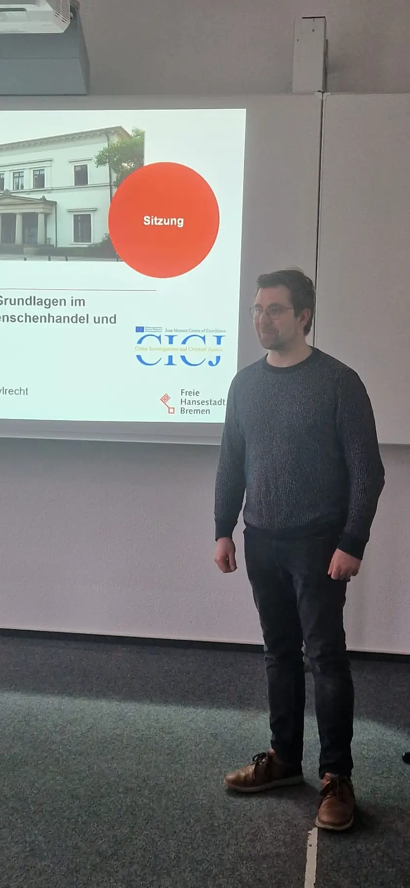 Über aufenthaltsrechtliche Grundlagen im Zusammenhang mit Menschenhandel und Zwangsprostitution hat der Vertreter des Senators für Inneres, Sebastian Bunse, Studierende des 5. Semesters Polizeivollzugsdienst am 19.11.2025 informiert. Diese haben das Wahlpflichtmodul Menschenhandel belegt, das im Rahmen des Jean-Monnet-Centers Crime Investigations and Criminal Justice (CCICJ) an der HfÖV Bremen stattfindet. Sebastian Bunse ist Mitglied der Arbeitsgruppe „Victims’ Rights“ des CCICJ. Er ging in seinem Vortrag u.a. auf das Aufenthaltsrecht für Menschenhandelsopfer und Zwangsprostituierte aus Drittstaaten sowie die vorgeschaltete Bedenk- und Stabilisierungsfrist ein. Diese rechtlichen Instrumente dienen der Herstellung äußerer Sicherheit für diese Betroffenen und sollen ihnen u.a. eine Kooperation im Strafverfahren erleichtern.
